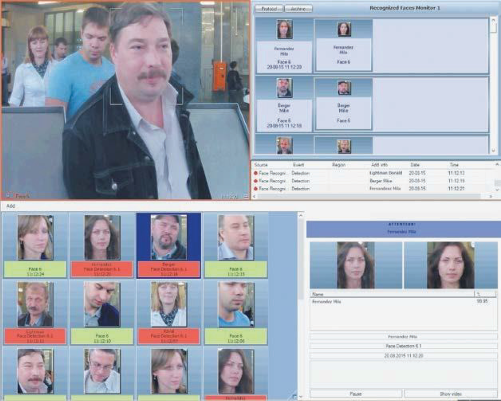 Face Intellect recognizes faces and automatically notifies when persons of interest are spotted. As the face database is built up over time, operators can search by photo or video frame. The facial recognition module automatically looks through past video and finds all instances when the person was n the camera field of view previously.